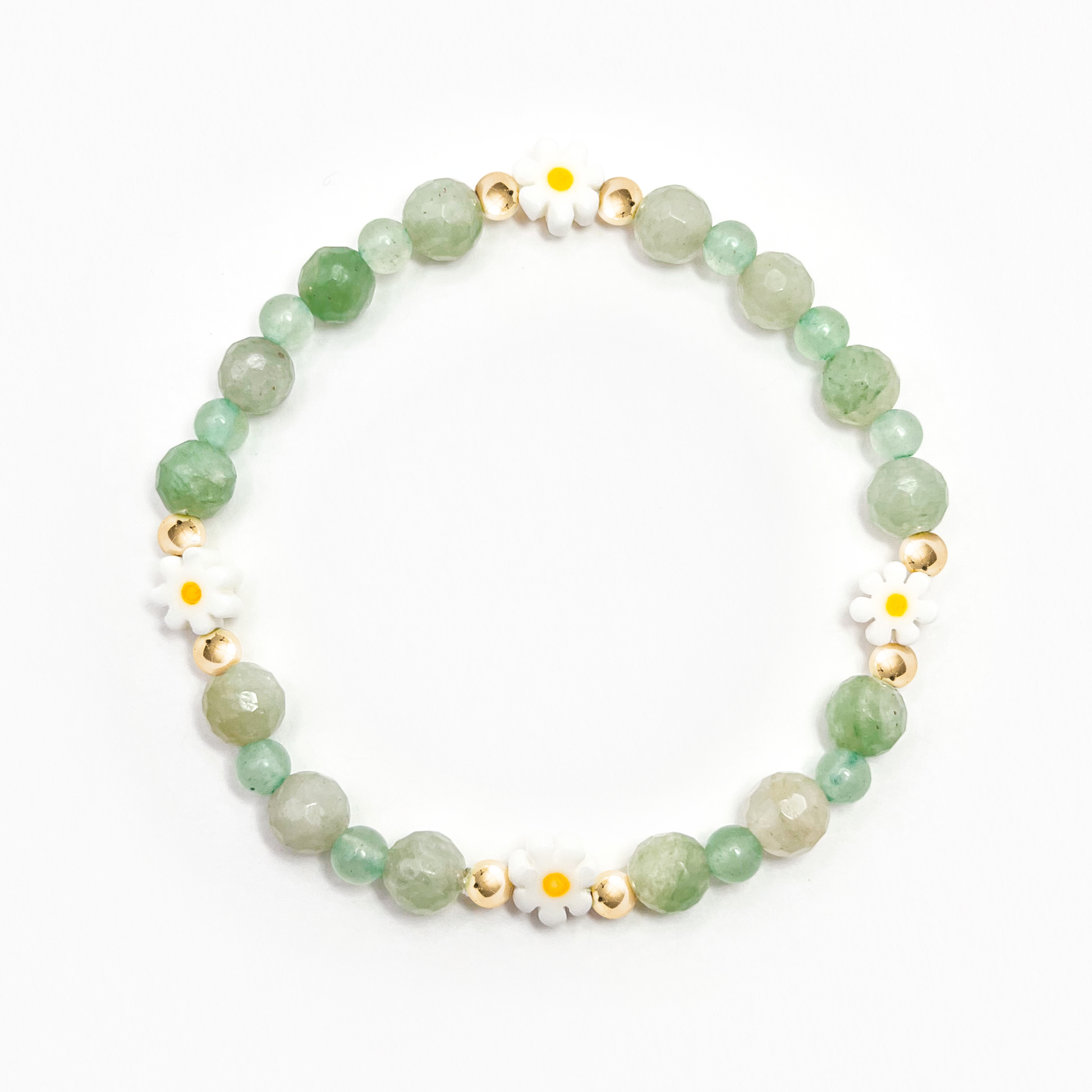 6mm faceted African jade with 4mm green aventurine, white millefiori daisy beads and your choice of 14k gold-filled or sterling silver accents.