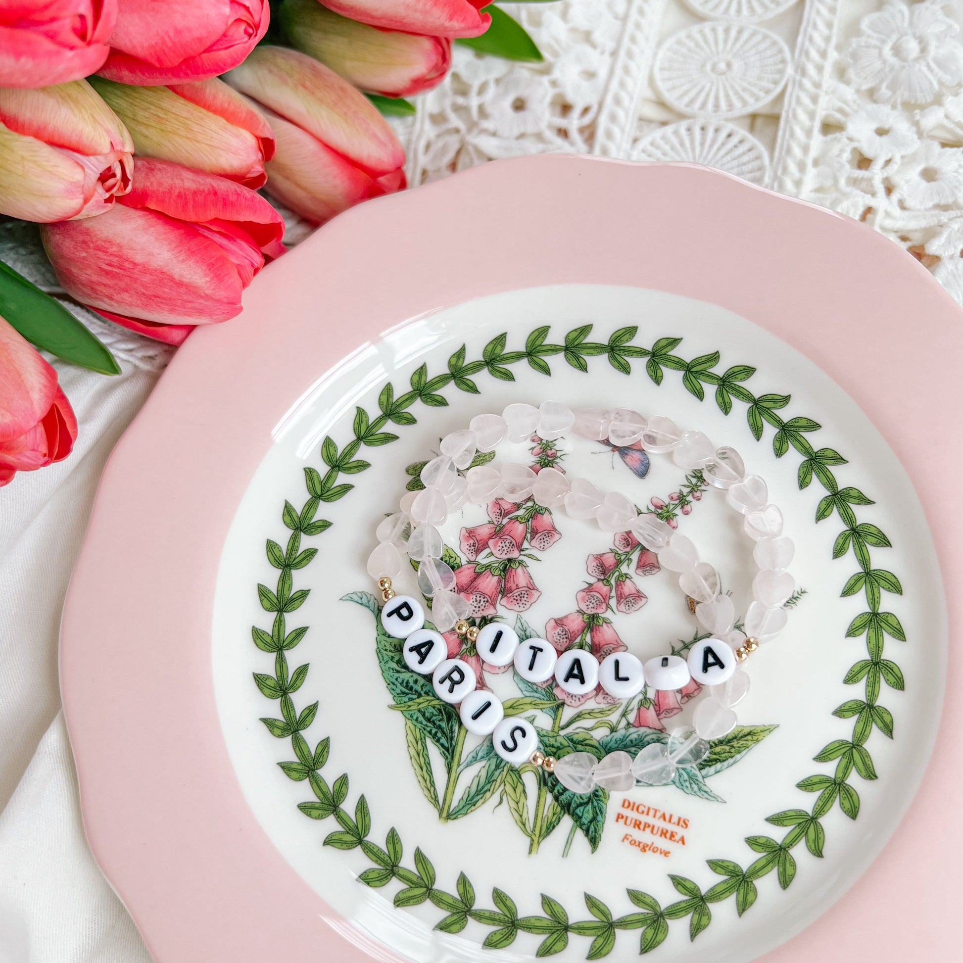 ♡ 10 characters max. Any space input will be represented by a heart or spacer bead depending on letter style.