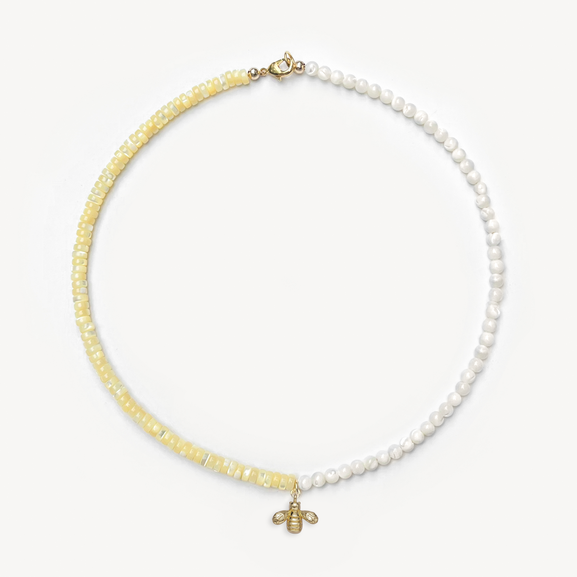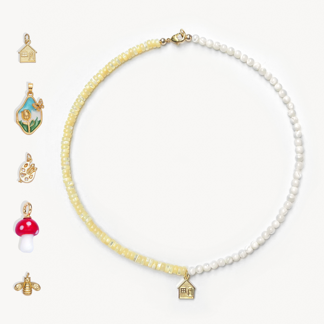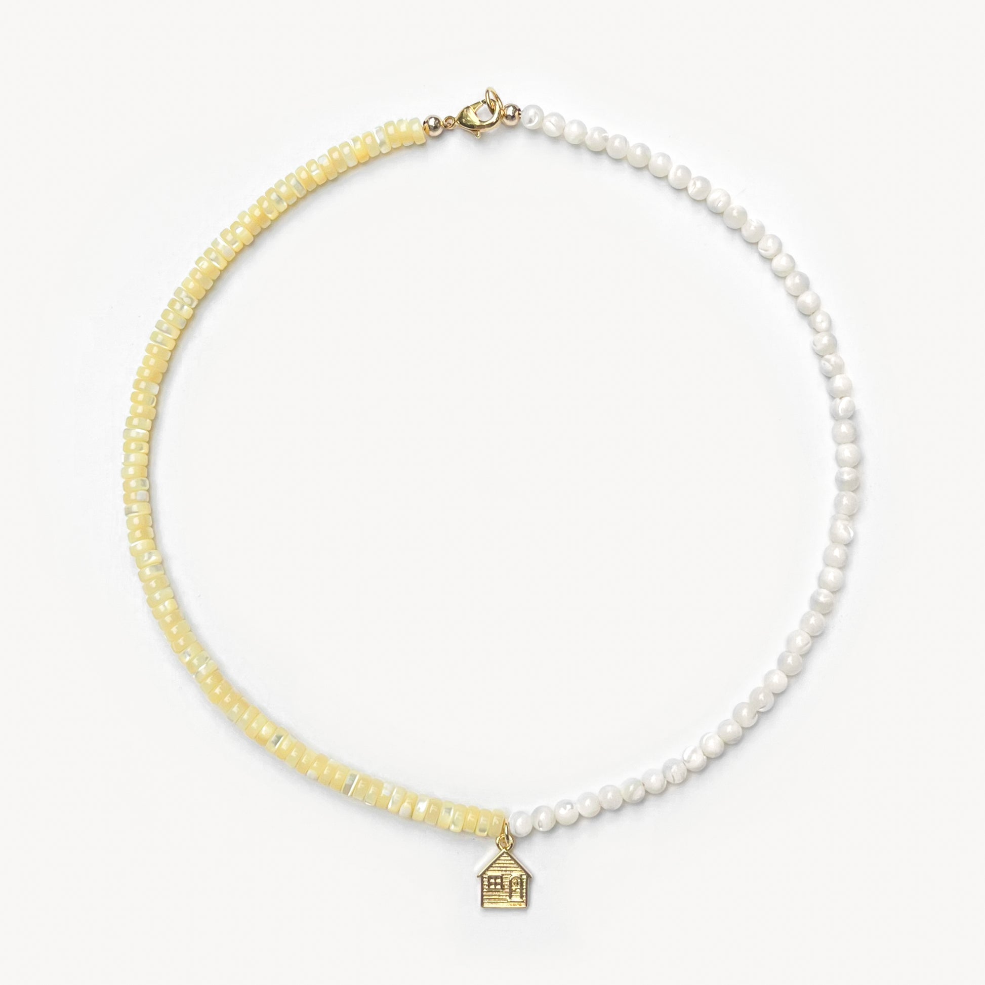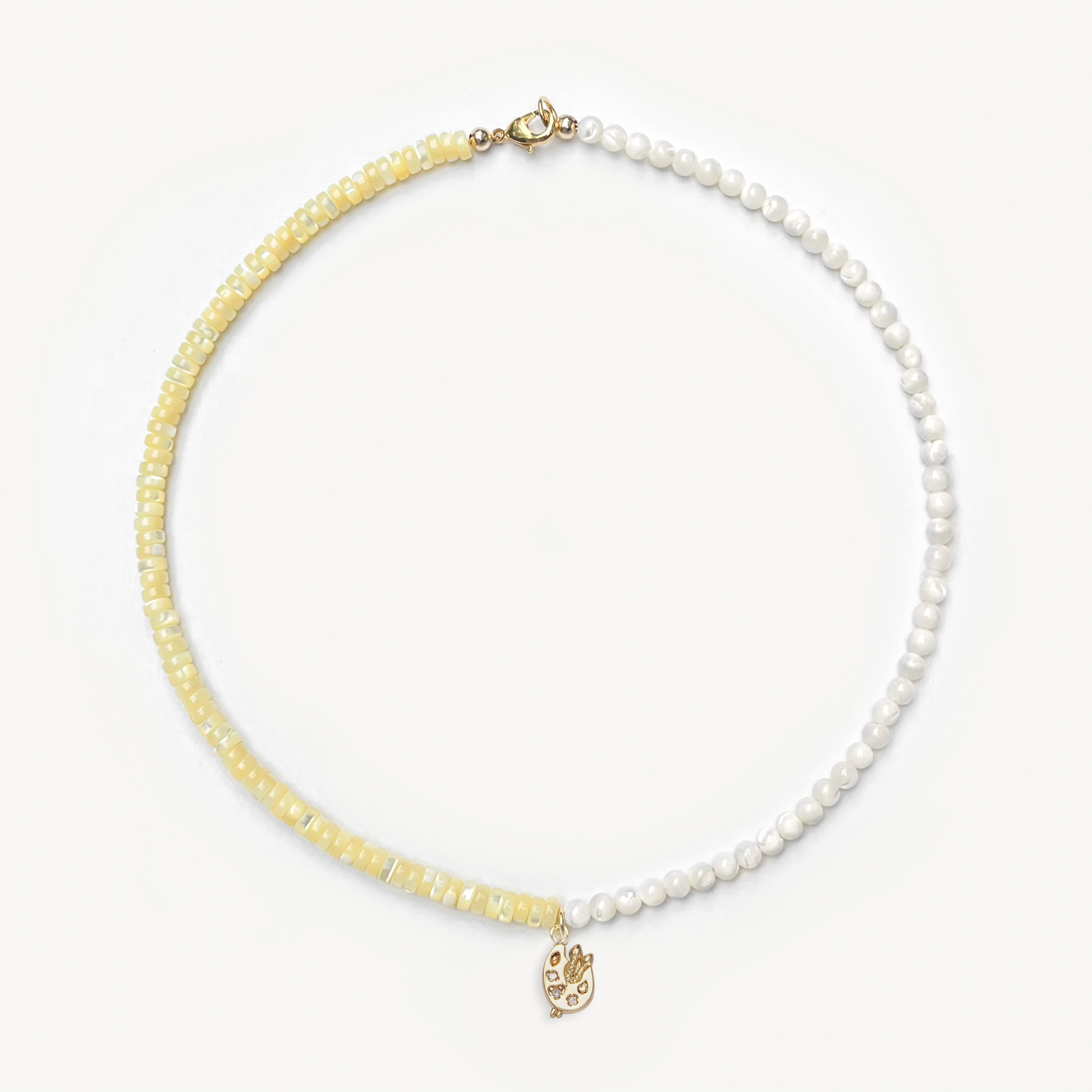 4mm round mother of pearl beads and yellow-dyed mother of pearl heishi beads with your choice gold-filled charm (16")