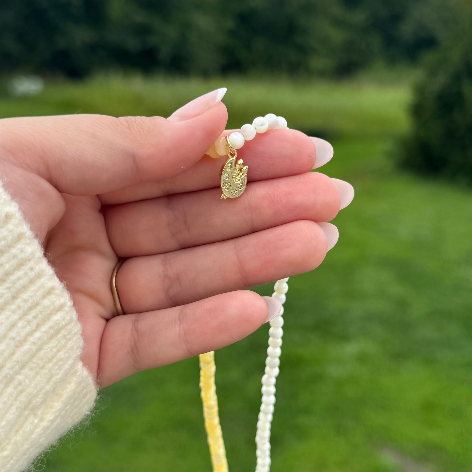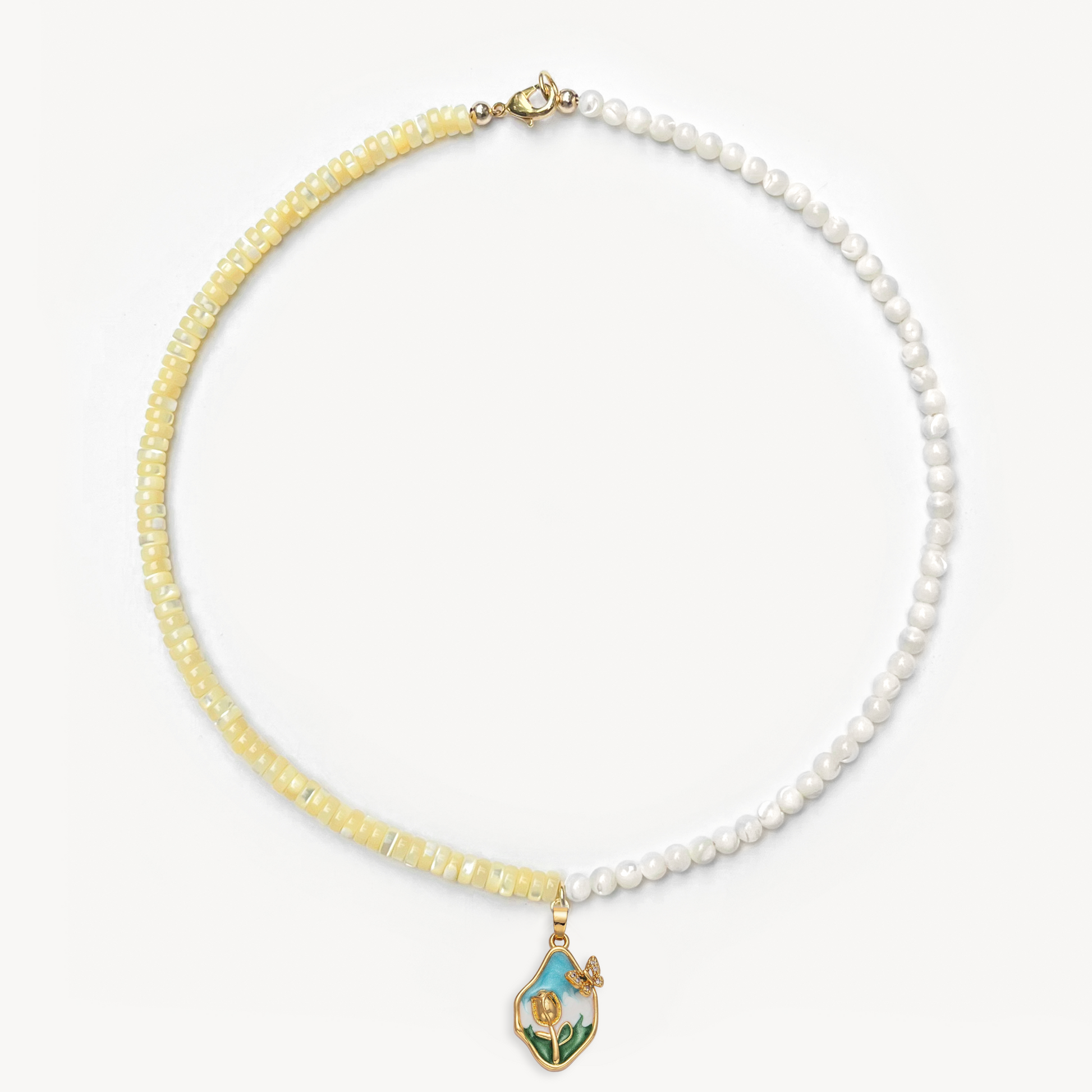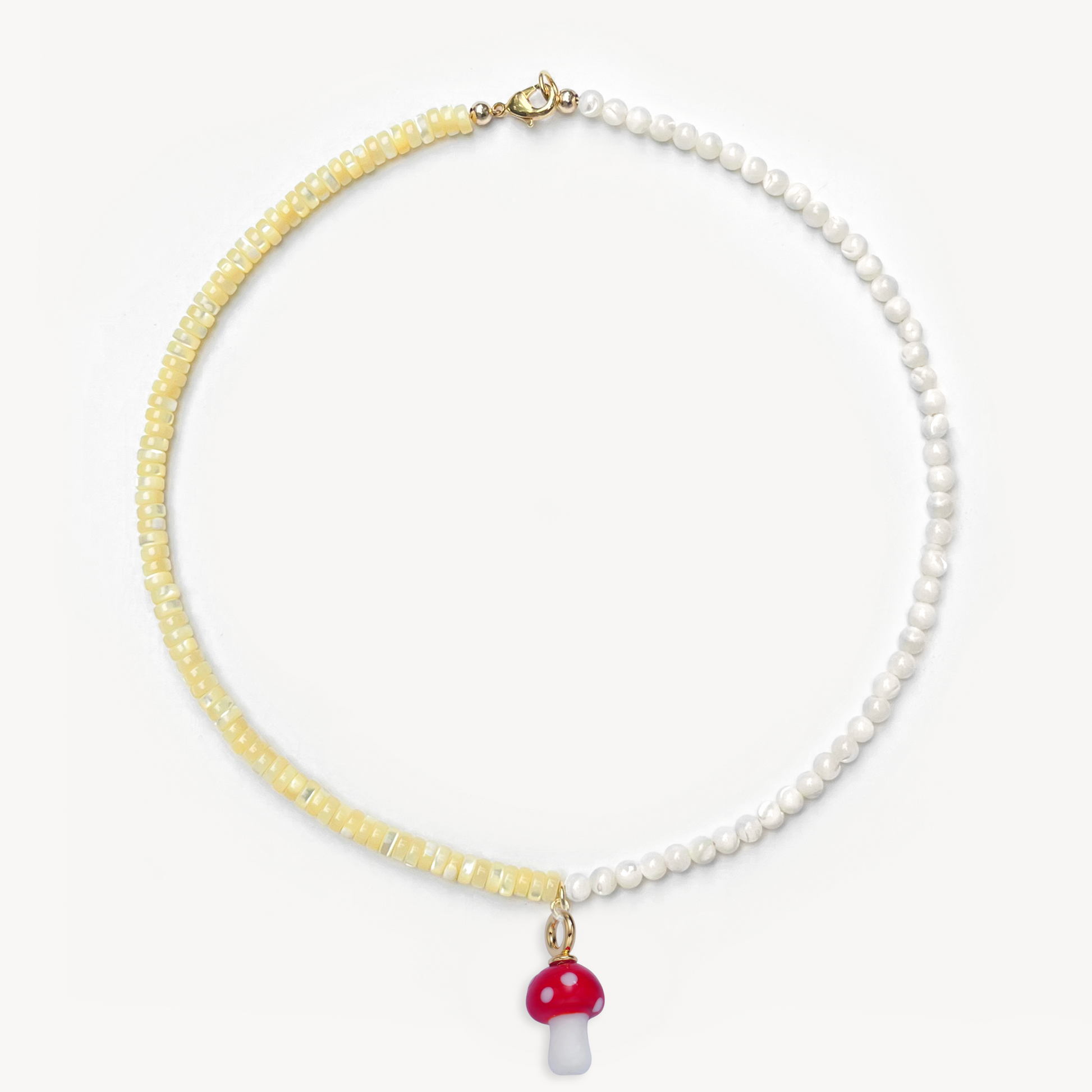 4mm round mother of pearl beads and yellow-dyed mother of pearl heishi beads with your choice gold-filled charm (16")
