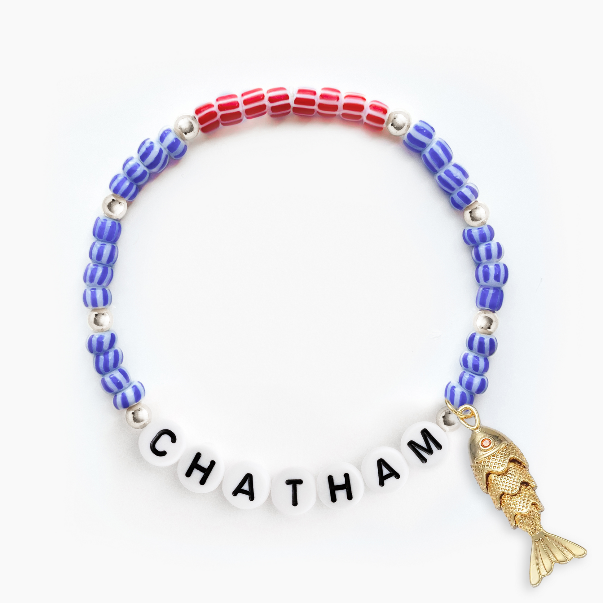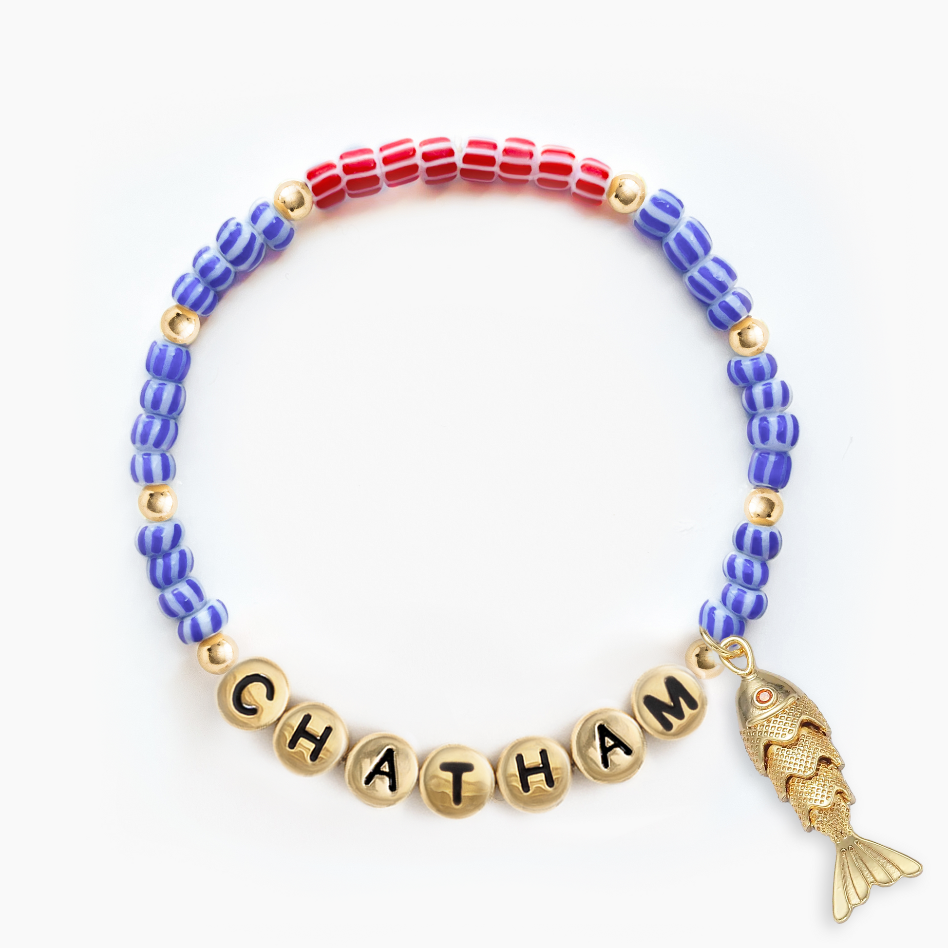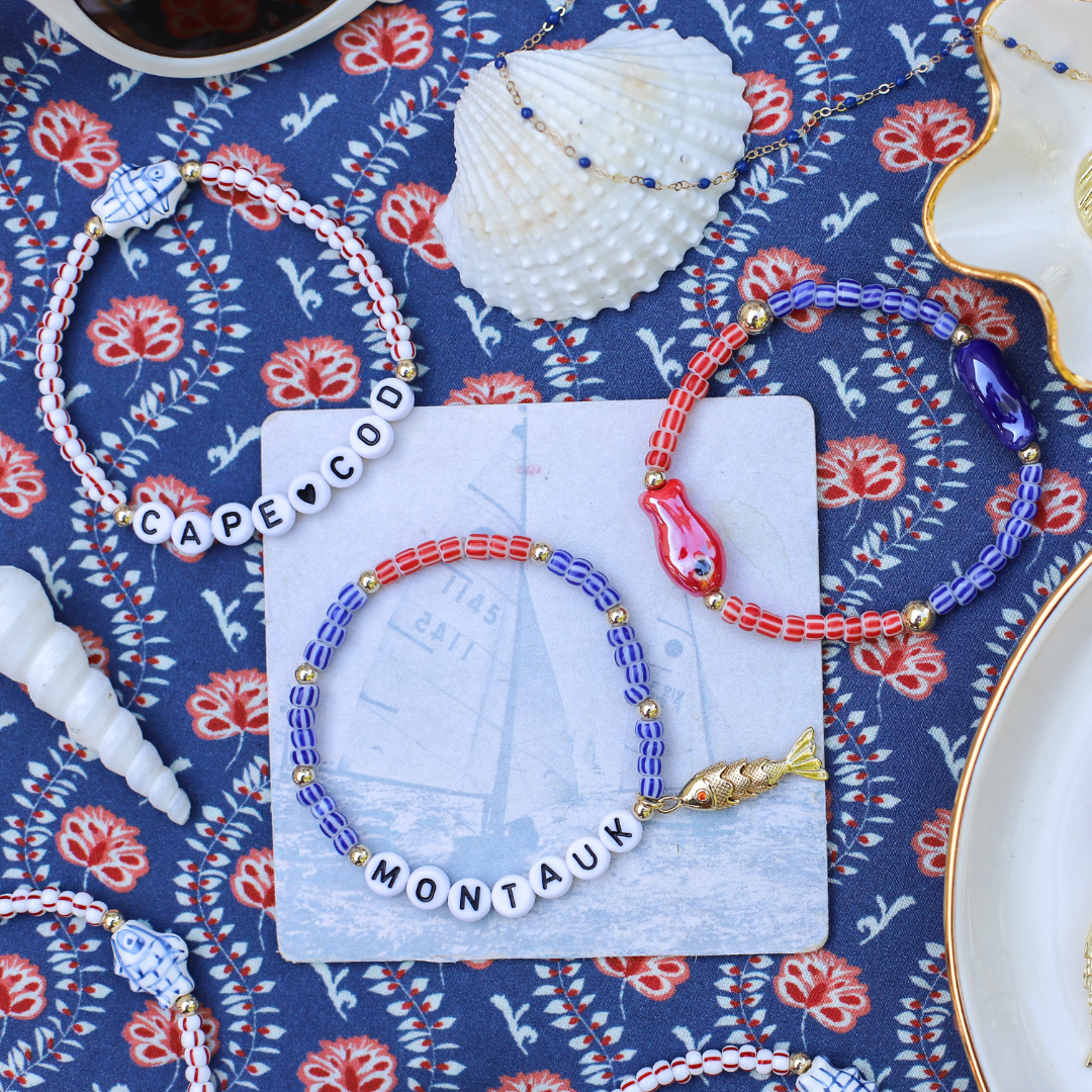 4-5mm blue and red striped glass seed beads with 4mm gold filled or sterling silver beads, optional 27mm fish charm and choice of letter beads. *Please note this bracelet does not automatically come with a charm, you must opt in below!