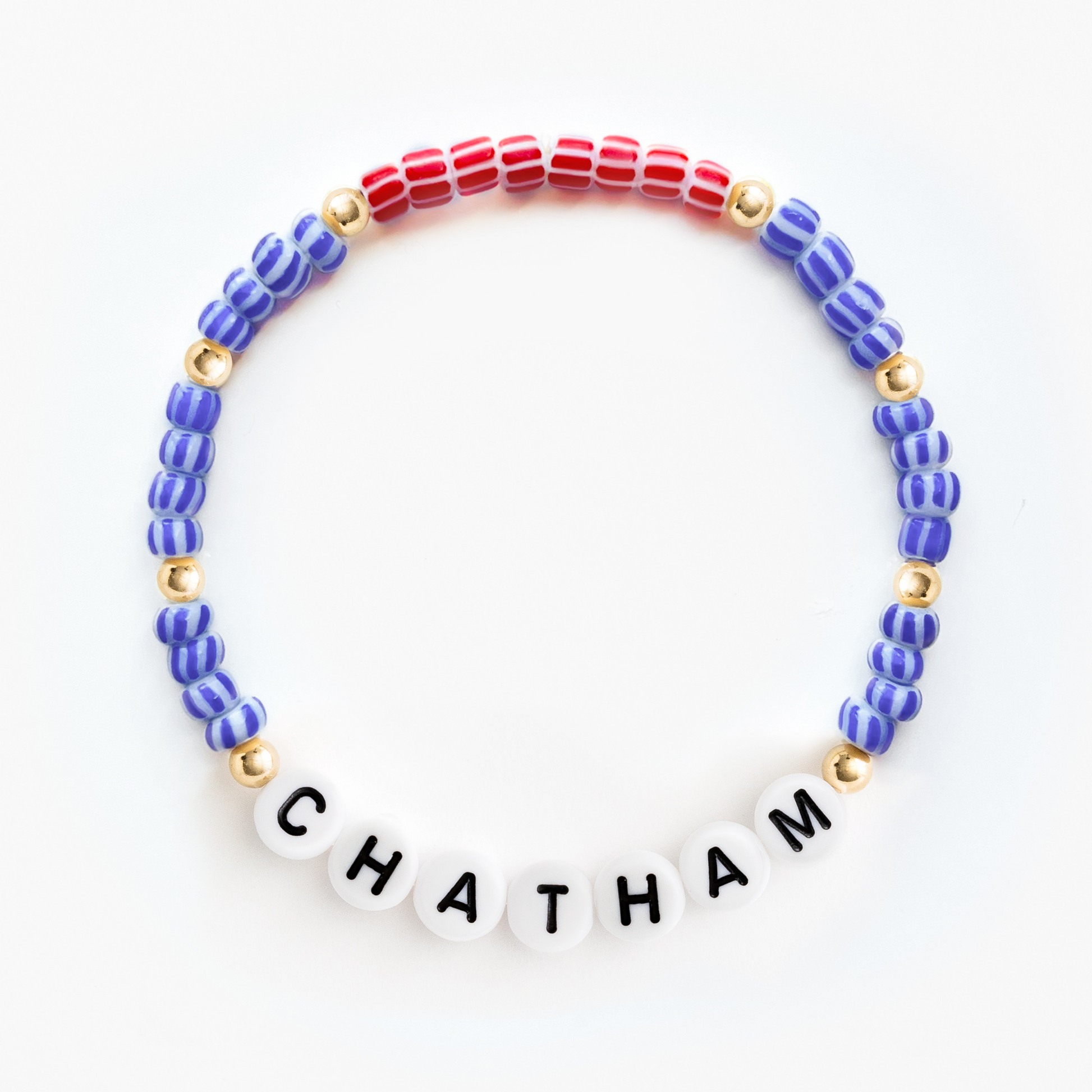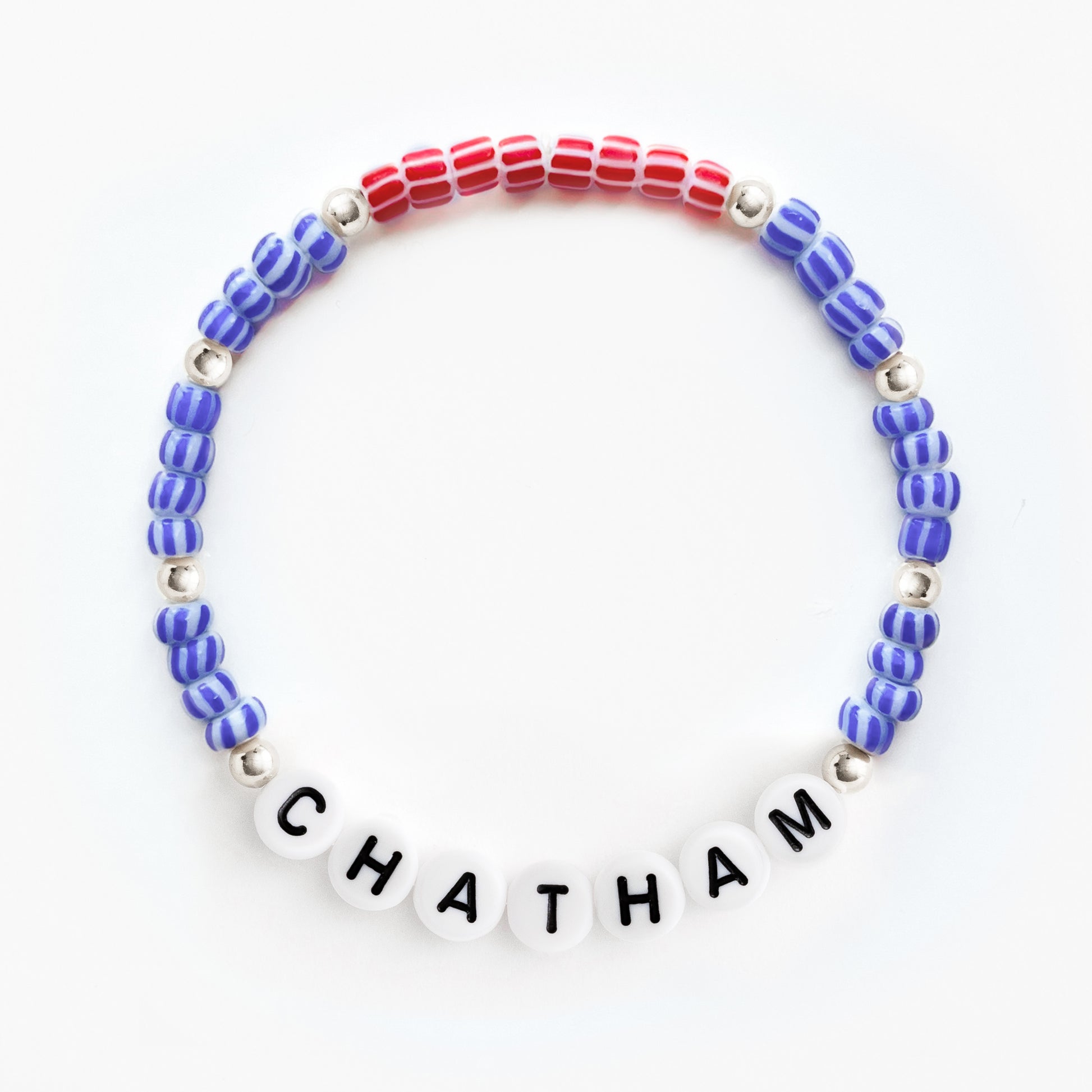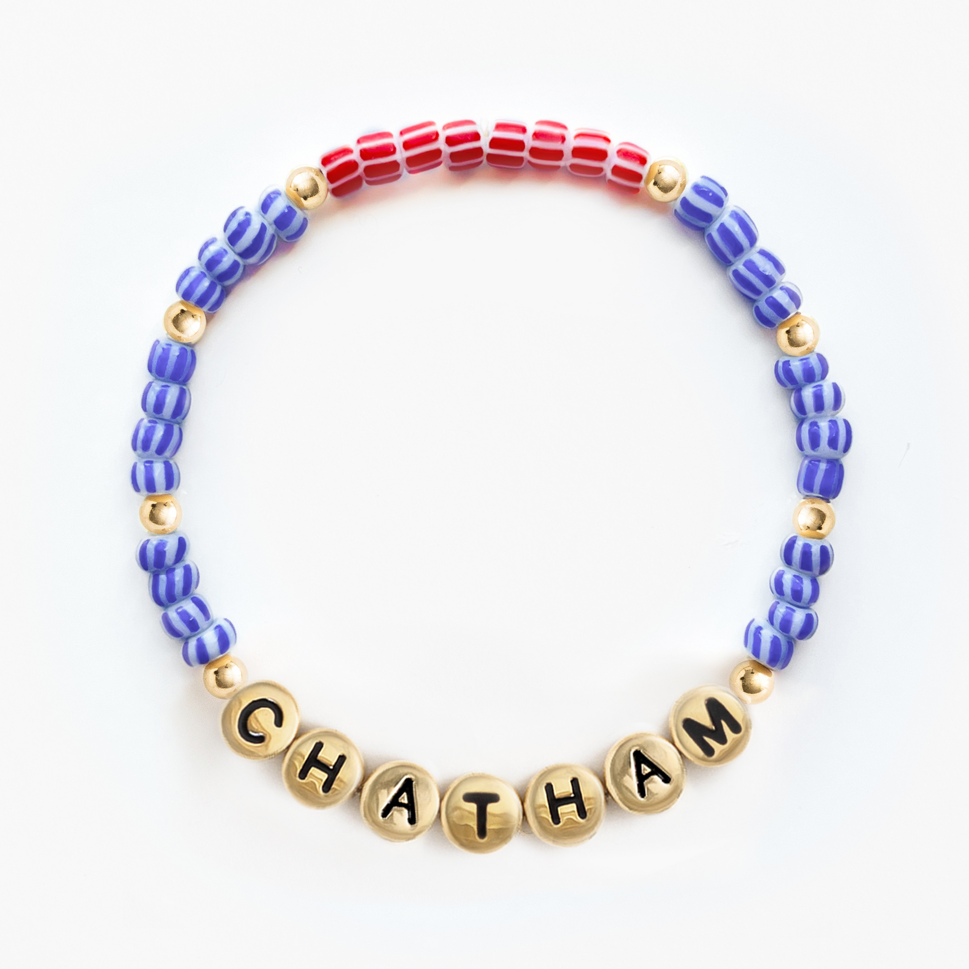 4-5mm blue and red striped glass seed beads with 4mm gold filled or sterling silver beads, optional 27mm fish charm and choice of letter beads. *Please note this bracelet does not automatically come with a charm, you must opt in below!