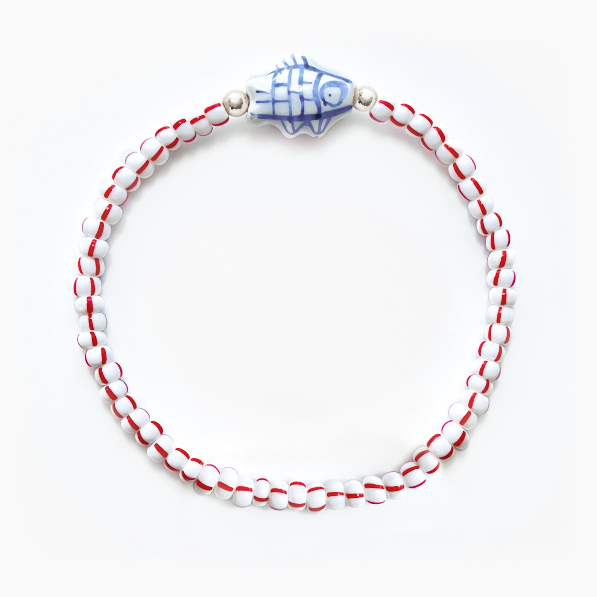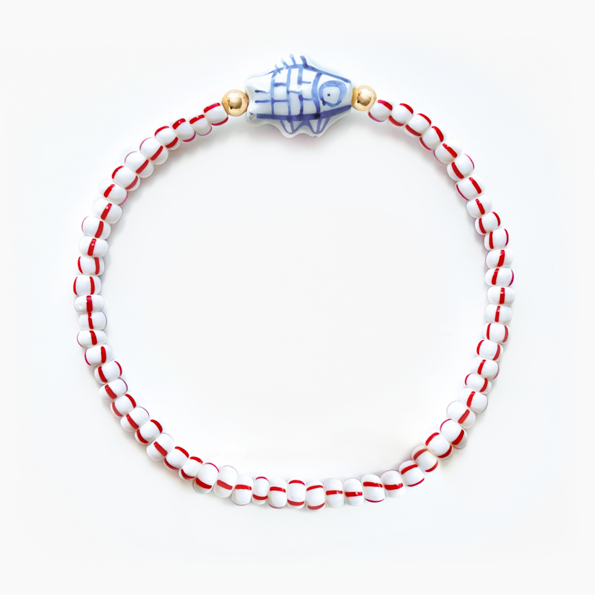 4-5mm white and red striped glass seed beads with 4mm gold filled or sterling silver end beads and a hand painted ceramic fish bead