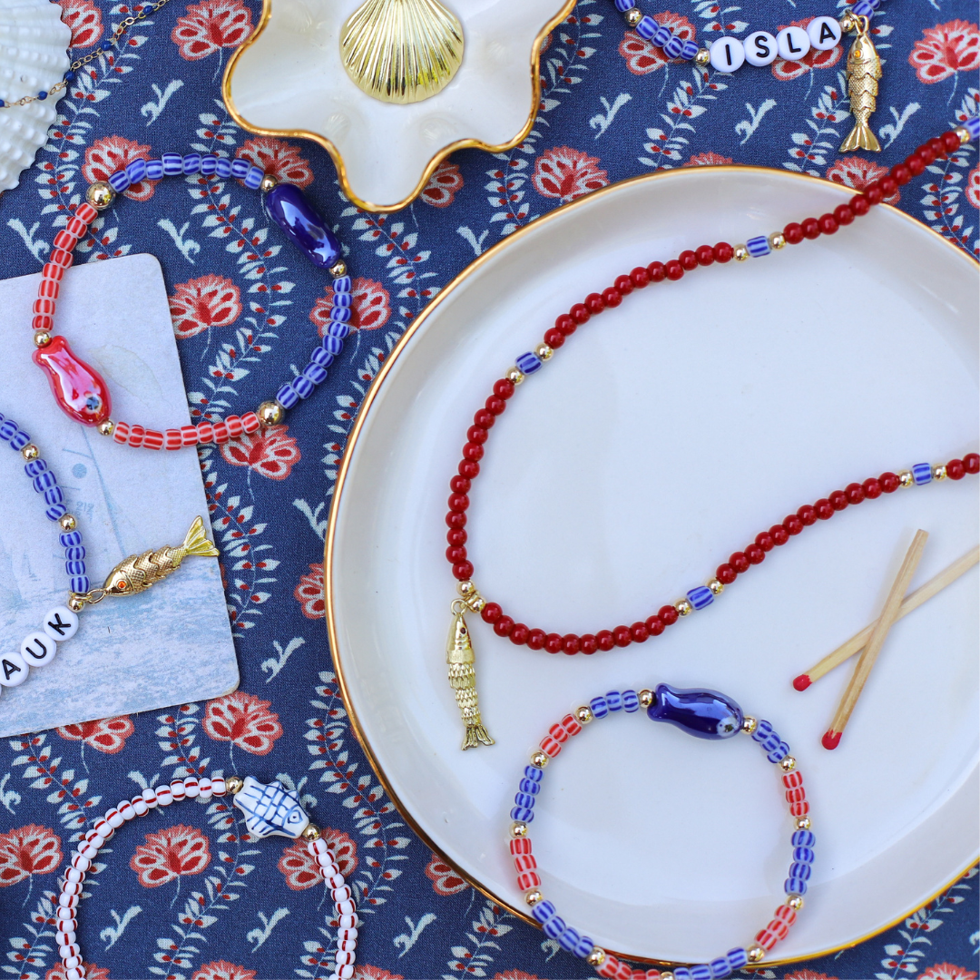 4mm red Czech glass beads with 4-5mm striped blue seed beads, 4mm gold filled beads and a 31mm fish charm (16")