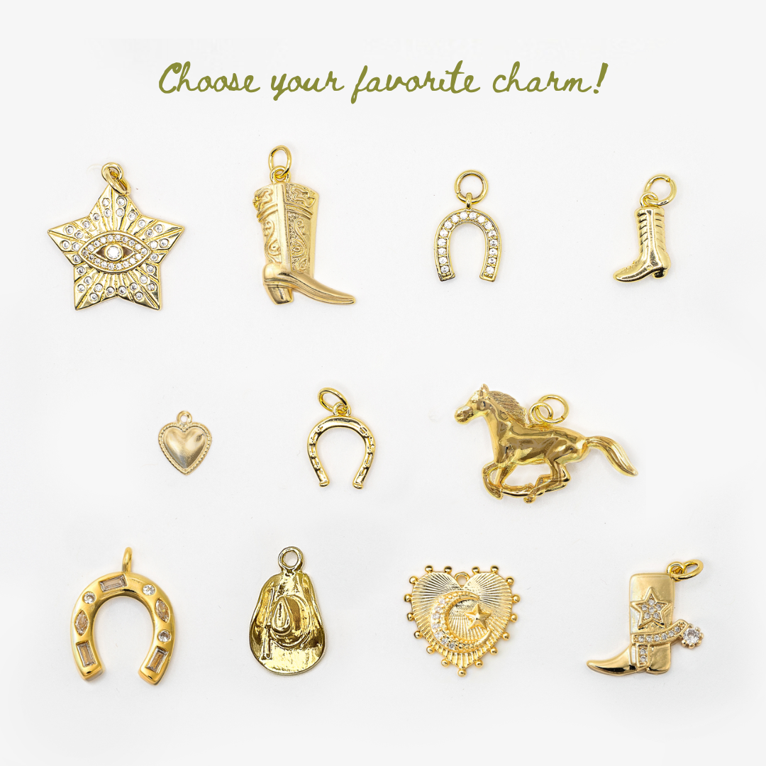 Gold PVD plated over stainless steel flat cable chain (18” + 2") with choice of charm