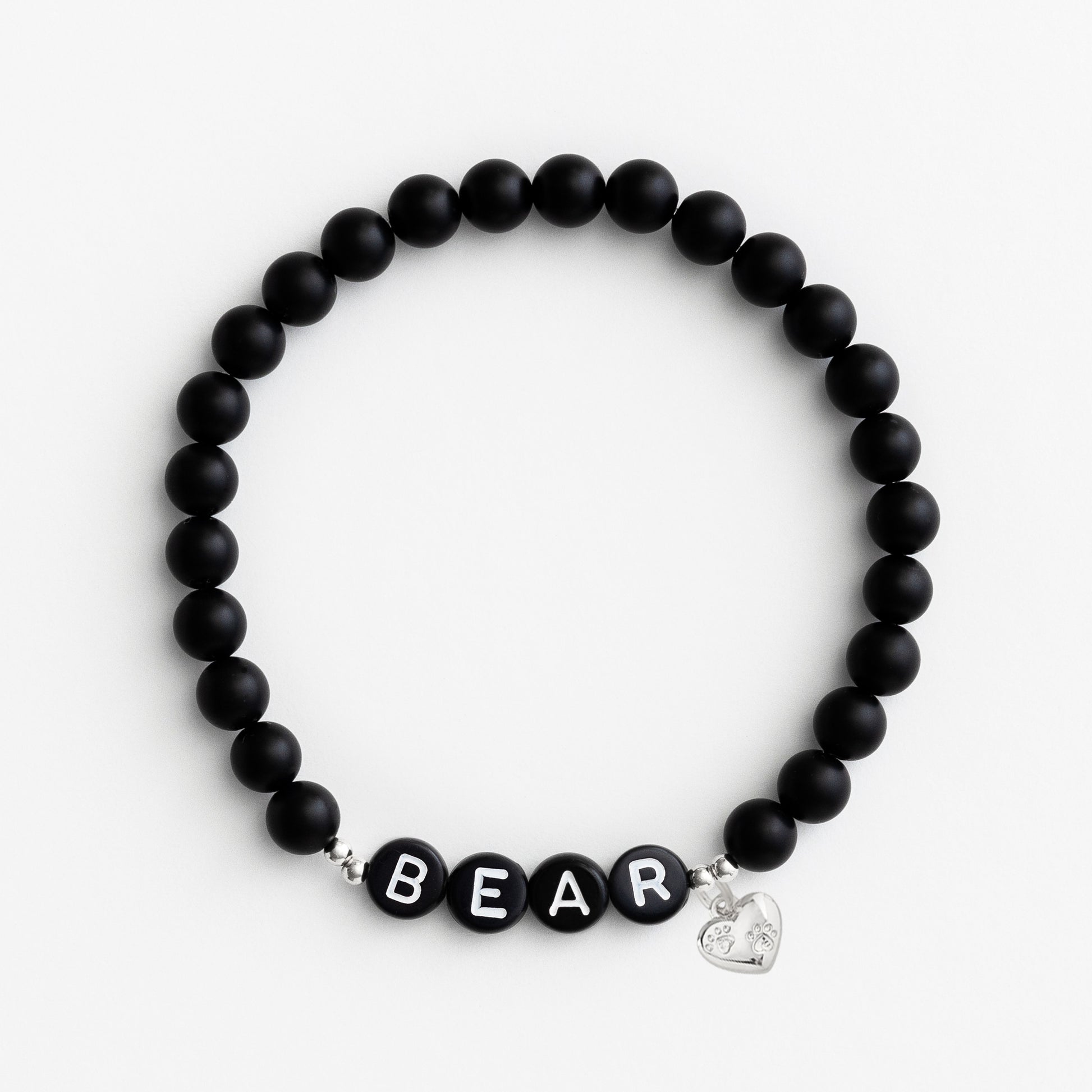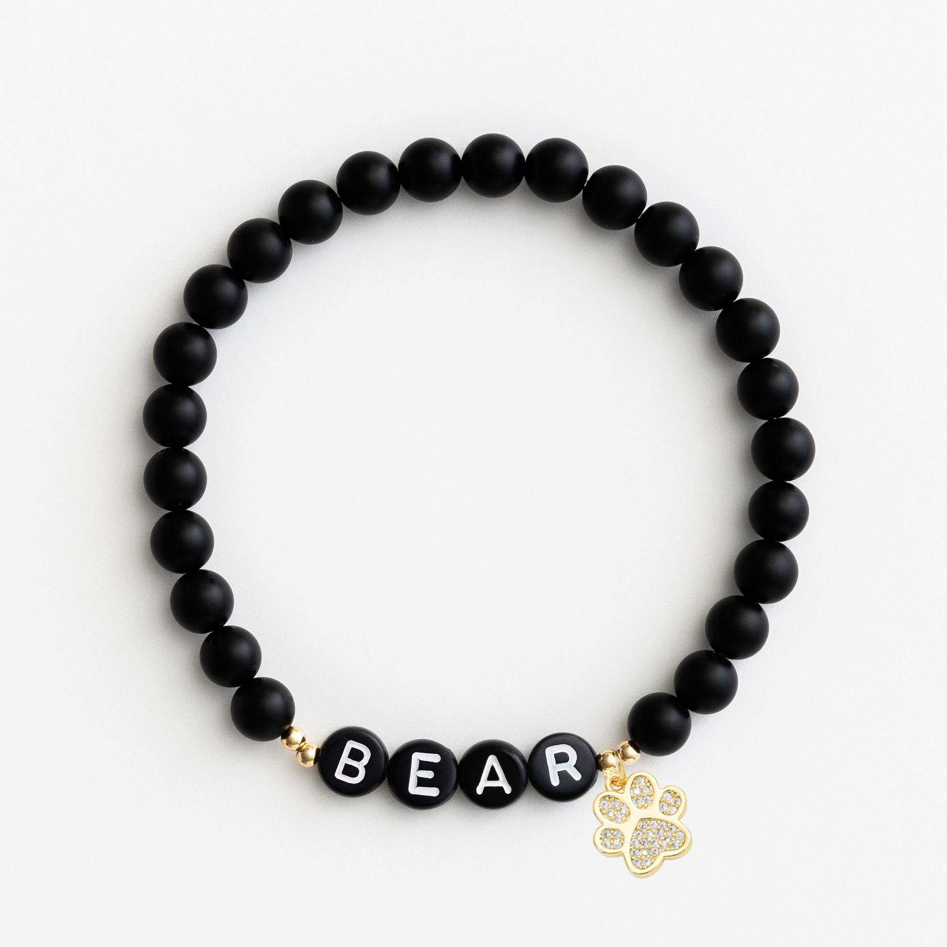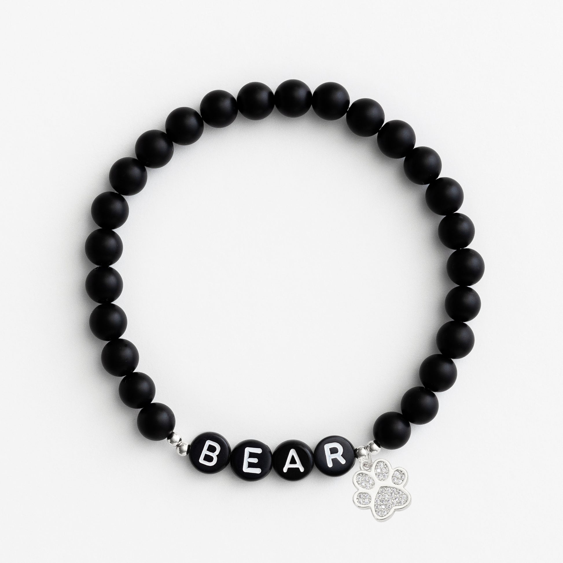 6mm natural matte black onyx with black acrylic letters and black plated paw print charm