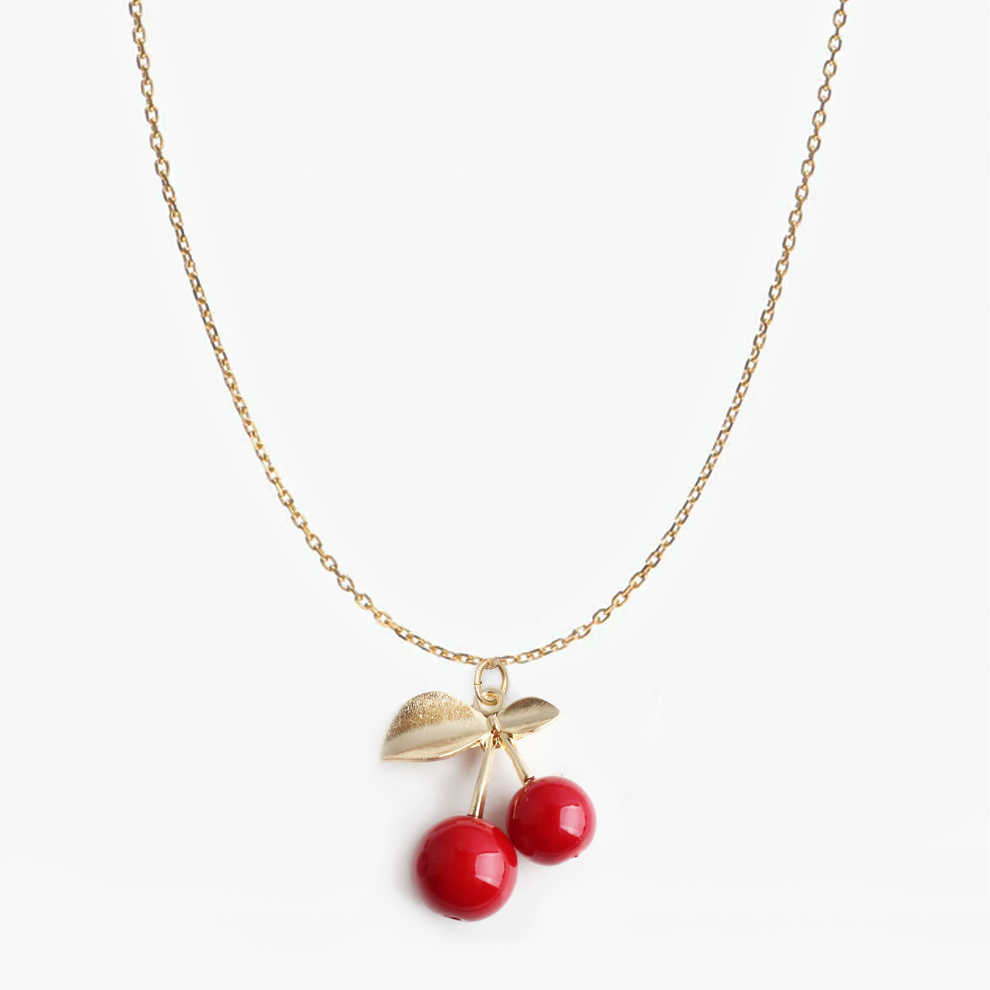 Gold PVD plated over stainless steel flat cable chain (18” + 2") with alloy drip cherry charm (25x28mm)